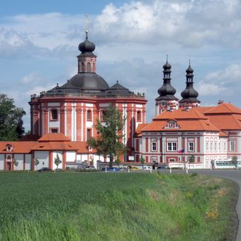 Mariánská Týnice é uma antiga abadia cisterciense com uma igreja que possui duas torres simétricas e uma cúpula proeminente. A estrutura exibe linguagem arquitetônica barroca com detalhes elaborados criados por Jan Santini Aichel.