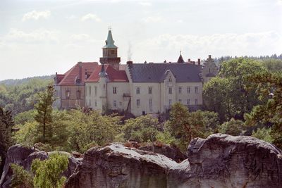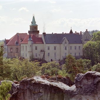 O castelo de pedra ergue-se sobre uma plataforma de arenito na região do Paraíso Boêmio, com uma torre de observação sobre a paisagem.