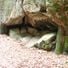 A formação de arenito se estende próxima ao Castelo de Hrubá Skála, exibindo padrões naturais de erosão que formam uma cavidade na superfície rochosa.