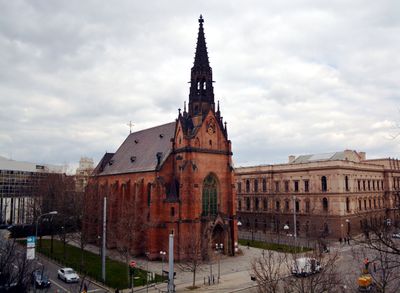A Igreja Vermelha em Brno e uma igreja protestante com uma fachada caracteristica de tijolos vermelhos que apresenta elementos de revival gotico e linhas verticais que definem seu design historicista. O edificio se destaca por sua forma arquitetonica clara e verticalizada e e reconhecido e mantido como um monumento cultural da Republica Tcheca.