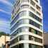 A estrutura de nove andares em concreto armado apresenta faixas alternadas de janelas e parapeitos estreitos rebocados ao longo de sua fachada de esquina arredondada.