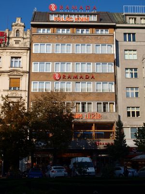 Sochy vlevo na balkonu hotelu Jalta na Václavském náměstí
