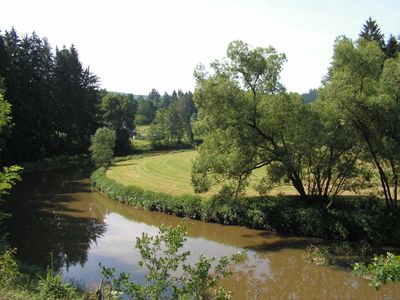Sluneční zátoka é uma enseada ao longo do rio Sázava onde a água forma uma curva natural cercada por margens arborizadas. O local apresenta um prado aberto que desce em direção à água, com árvores proporcionando abrigo nas bordas.