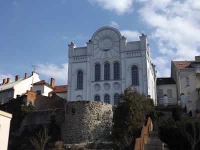 O edifício foi construído em 1863 pelo arquiteto vienense Franz Macher, substituindo uma estrutura anterior. Essa nova construção ocorreu durante um período de expansão da comunidade judaica da cidade.