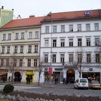 Sochy vpravo na balkonu hotelu Jalta na Václavském náměstí