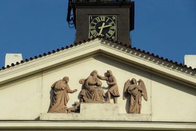 Reliéf Tobiáš léčí slepce ve štítu budovy Klárov 3, reliéf v Praze