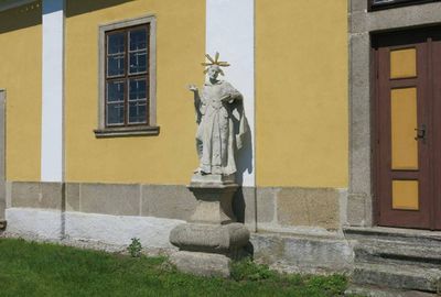 Socha světce vlevo na terase kostela Nanebevzetí v Chlumu u Třeboně