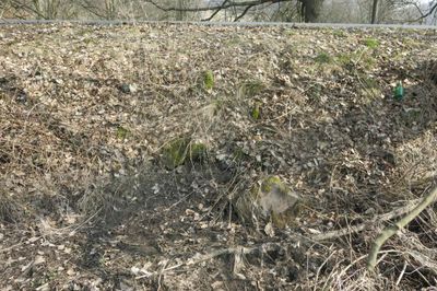 Povalený podstavec s ulomeným kovovým křížem pod lípou v lukách u Lipové