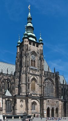 A Grande Torre do Sul da Catedral de São Vito é uma estrutura gótica que se eleva 96,6 metros acima do Castelo de Praga. A torre exibe alvenaria de pedra talhada com detalhes decorativos em toda a sua altura, demonstrando a perícia dos construtores medievais.