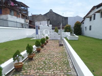 O local de sepultamento apresenta uma estrutura tradicional com elementos decorativos na rua Jalan Kampung Kuli no distrito comercial antigo de Melaka.