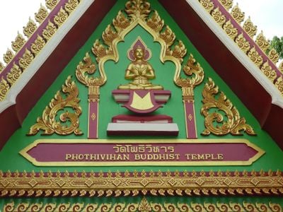 Wat Phothivihan contém diversos edifícios com telhas douradas, motivos religiosos e uma estrutura central que abriga uma estátua de Buda reclinado de 40 metros.