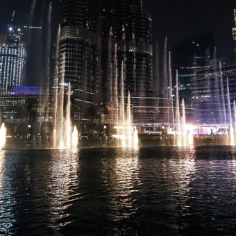 A Dubai Fountain é um grande sistema de fontes coreografadas situado num lago artificial aos pés do Burj Khalifa. A instalação inclui jatos, correntes de água e elementos móveis que se sincronizam com música e efeitos de iluminação.
