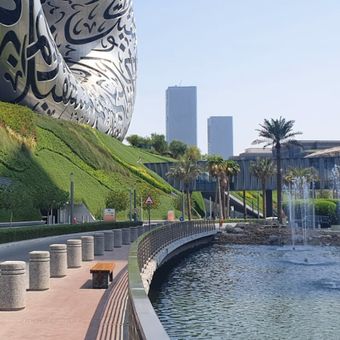 O exterior do edifício apresenta janelas com caligrafia árabe formando poesia sobre visões do futuro, criadas pelo artista emiradense Matar Bin Lahej.