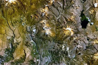 A paisagem exibe formações geológicas distintas visíveis em imagens de satélite, com seções cobertas de neve contrastando fortemente com faces rochosas escuras. Essas diferenças visuais resultam de variações na composição das rochas e processos de erosão nesta altitude.