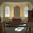 A igreja de madeira apresenta elementos do estilo gótico com arcos pontiagudos, uma única nave que leva a um pequeno altar e teto escuro.