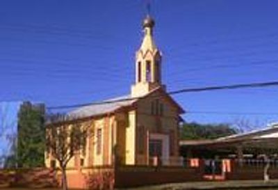 A Igreja Ortodoxa de São Pedro e São Paulo apresenta elementos arquitetônicos russos com tetos pintados e numerosos ícones emoldurados em pedestais.