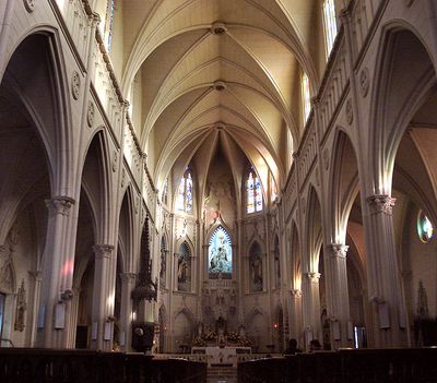 A igreja apresenta design neogótico com uma torre octogonal coroada por uma estátua de Santa Teresinha, esculpida por Alfred Adloff.