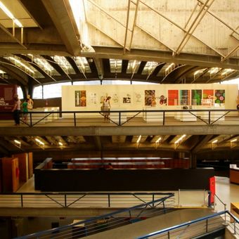 A Coleção de Arte da Cidade de São Paulo ocupa um edifício modernista com estrutura suspensa apoiada por colunas retangulares vermelhas.