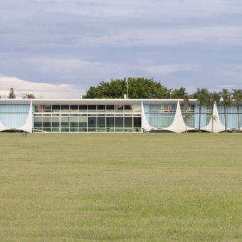 O palácio ergue-se numa península do lago Paranoá, com colunas de mármore branco e paredes de vidro em sua estrutura modernista.