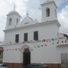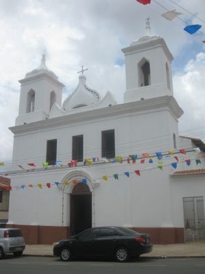 A igreja apresenta duas torres sineiras, um frontão curvilíneo e azulejos portugueses revestindo as paredes interiores do seu estreito deambulatório.