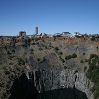 Kimberley é uma cidade no Município Local de Sol Plaatje, Província do Cabo Norte, espalhada em torno de uma antiga mina de diamantes. O entorno mostra pradarias planas com arbustos espinhosos dispersos sob céus amplos, enquanto as ruas se estendem para fora a partir da cratera central.