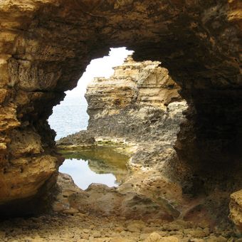 Processos naturais de erosão ao longo da Great Ocean Road criaram esta estrutura através da interação entre rochas calcárias e água marinha.