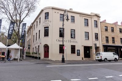 O Orient Hotel ocupa um edifício colonial de três andares no número 87-89 da George Street, apresentando uma fachada curva e paredes de tijolos estucados.