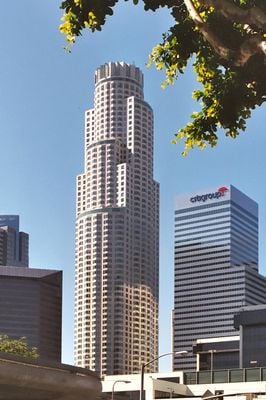 A Torre U.S. Bank eleva-se a 310.3 metros com 73 andares acima do solo e apresenta uma coroa de vidro que ilumina o perfil de Los Angeles.