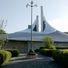 O templo apresenta paredes exteriores brancas, formas geométricas e grandes janelas que iluminam a sala principal de oração e o espaço do altar.