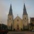 A Igreja Católica Santa Maria apresenta arquitetura neogótica com arcos pontiagudos, tetos abobadados e vitrais detalhados retratando cenas bíblicas.