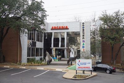O exterior do edifício incorpora a placa Arcadia recuperada da Greenville Avenue, conectando a história de Dallas com a arte geométrica contemporânea.