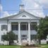 O terreno do tribunal apresenta uma entrada com colunas brancas rodeada por carvalhos, magnólias e cornizos, com um coreto central.