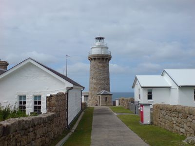 A torre cilíndrica branca ergue-se 19 metros sobre os penhascos de granito, com uma lanterna e varanda sobre o estreito de Bass.