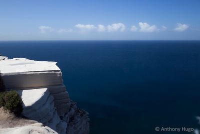 A formação cúbica branca eleva-se 25 metros acima do nível do mar, com bordas retas e camadas distintas nos penhascos costeiros.