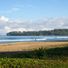 A baía curva de três quilômetros se estende entre falésias de basalto, com praias de areia branca e montanhas que alcançam 1,200 metros.