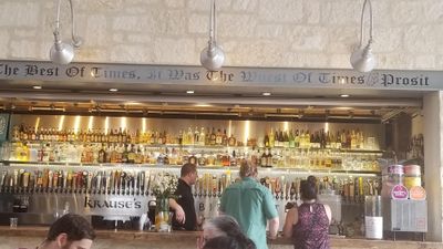 O restaurante serve comida alemã e texana diariamente em ambas as seções da propriedade, oferecendo um ambiente relaxado para comer e permanecer. Os visitantes podem jogar boliche enquanto desfrutam de comida e bebidas, ou simplesmente se sentar sob as árvores na área externa e relaxar.