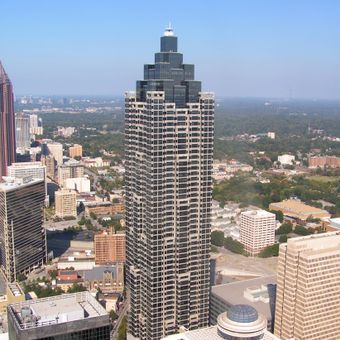 John C. Portman Jr projetou esta torre comercial durante a expansão imobiliária dos anos 1980, concluindo sua construção em 1992.