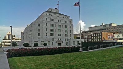 O Edifício Federal Martin Luther King Jr. ergue-se por dez andares com base de granito, paredes de calcário e tijolos amarelos.