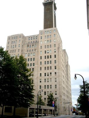 O edifício Southern Bell Telephone Company de 14 andares apresenta fachadas de calcário com padrões geométricos e uma torre de comunicações.