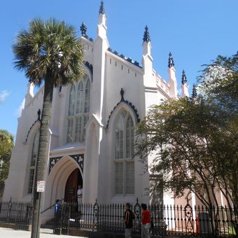 A Huguenot Church é um edifício neogótico em Charleston com arcos apontados, vitrais elaborados e um campanário proeminente na esquina das ruas Meeting e Broad. No interior, bancos de madeira levam ao altar sob um teto abobadado, mostrando a arquitetura religiosa clássica do século XIX.