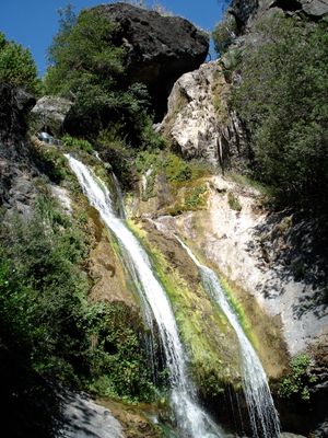 O riacho Salmon desce por um cânion ao longo da serra Santa Lucia, formando uma cachoeira de 36 metros que cria múltiplas cataratas.