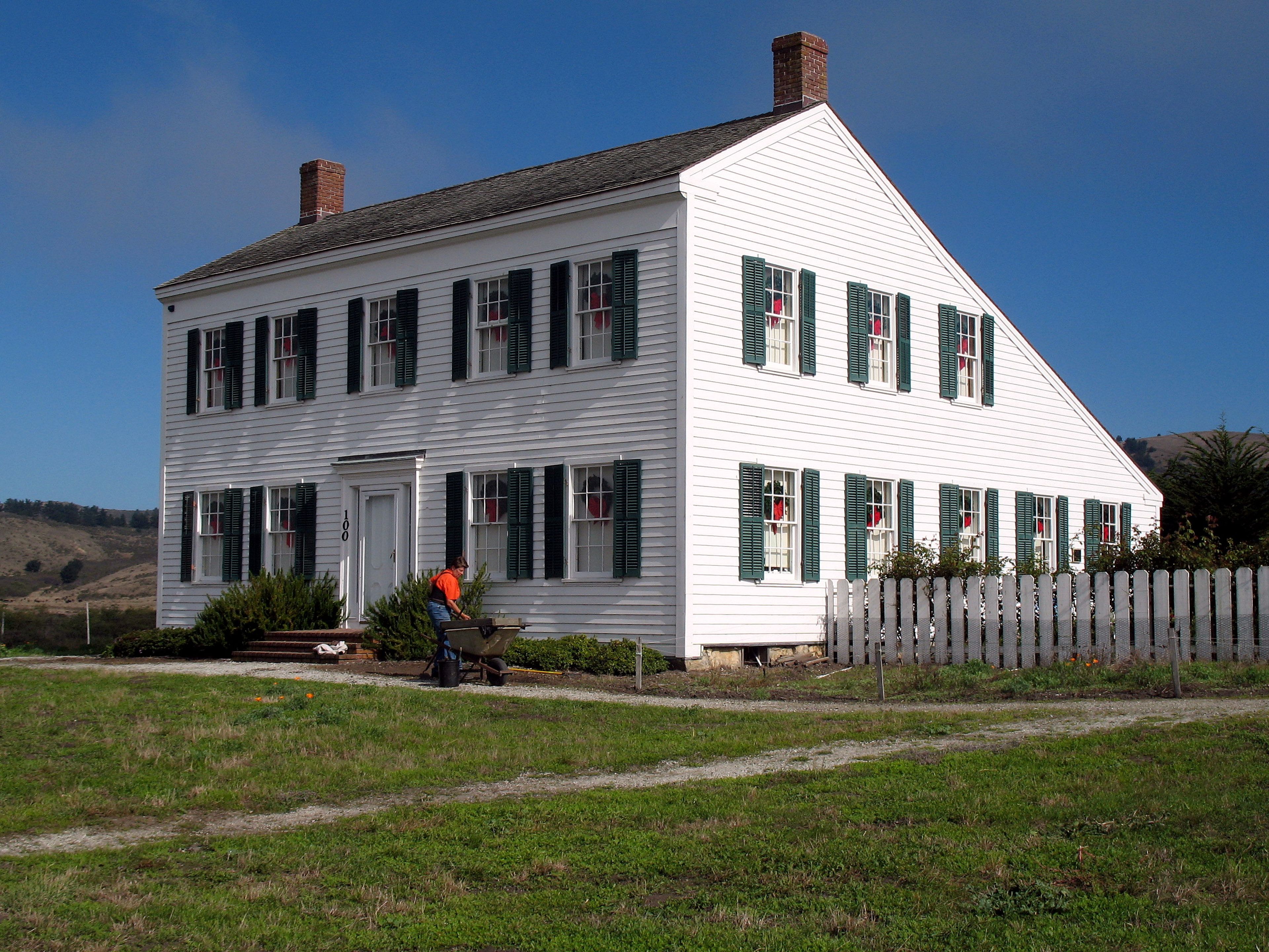 A casa combina elementos arquitetônicos da Nova Inglaterra com influências espanholas, refletindo a fusão das tradições na Califórnia inicial.