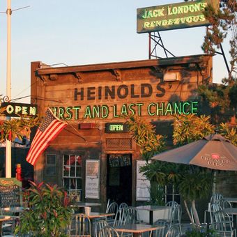 Heinold's First and Last Chance Saloon é um pequeno bar histórico na beira-água de Oakland localizado em um edifício estreito e antigo de madeira. O interior é apertado e compacto, com madeira escura, fotografias nas paredes e um balcão longo que preserva o caráter de um estabelecimento portuário original.