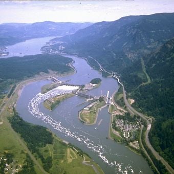 A Barragem Bonneville estende-se por 1056 metros através do Rio Columbia entre o Condado de Multnomah, Oregon, e o Condado de Skamania, Washington, com duas usinas.