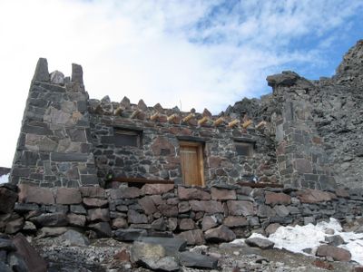 Camp Muir é um abrigo na encosta sudeste do Monte Rainier a cerca de 3100 metros de altitude, servindo como ponto de descanso para escaladores em sua subida. A cabana apresenta estruturas rústicas construídas com materiais naturais que se integram à paisagem montanhosa.