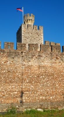 O castelo apresenta uma torre de menagem quadrada com quatro torres conectadas por uma passarela e um portão de entrada que leva ao pátio principal.