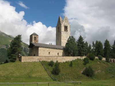 San Gian é uma igreja em Celerina com paredes de pedra e uma torre sineira distintiva que se eleva acima da paisagem do vale Engadin. A estrutura apresenta características arquitetônicas regionais típicas desta parte da Suíça.