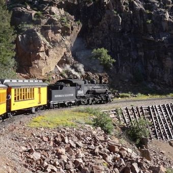 A Durango and Silverton Narrow Gauge Railroad é uma ferrovia patrimonial que percorre 45 milhas de trilhos entre duas antigas cidades mineiras através das montanhas de San Juan no sudoeste do Colorado. Os trilhos seguem paredes íngremes de desfiladeiro ao longo do rio Animas, onde o trem viaja a poucos metros da água e contorna paredões rochosos que se abrem para vistas dos picos circundantes.