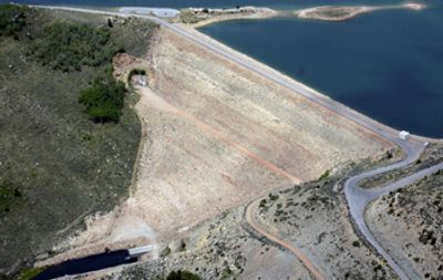 A barragem Soldier Creek estende-se por 390 metros de comprimento e eleva-se a 83 metros de altura, controlando o fluxo do rio Strawberry na Floresta Nacional Uinta.