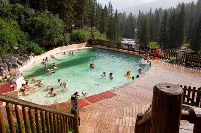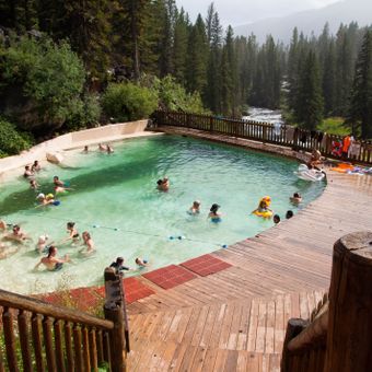 A piscina artificial de Granite Hot Springs mantém uma temperatura de 40 graus Celsius e localiza-se próxima às cachoeiras de Granite Creek.